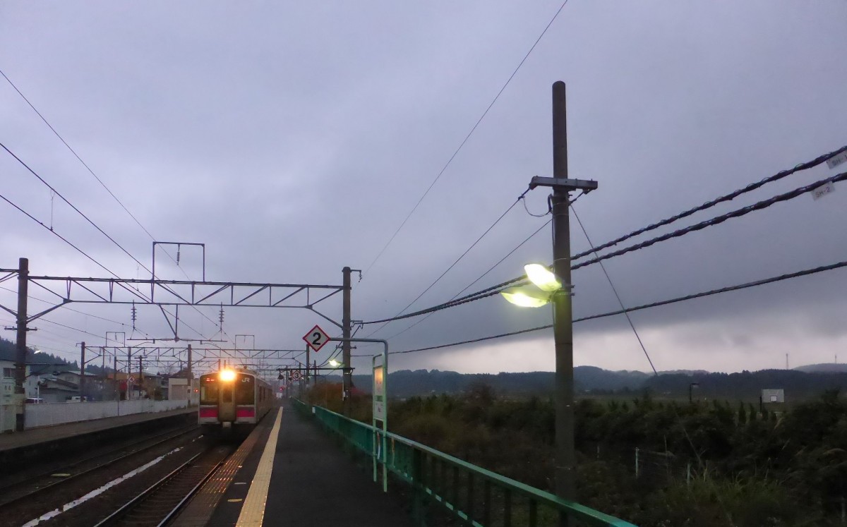 Serie 701 des Bezirks Akita - auf der Nordwest-Hauptlinie: Zug 701-103 in Katsurane; das Meer ist rechts knapp sichtbar. 2.November 2013. Peter Ackermann