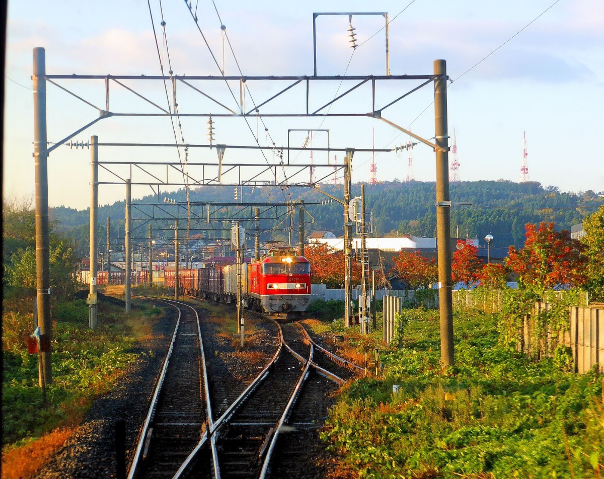 Serie 701 des Bezirks Akita - Begegnungen: Bild aus Zug 701-1 bei der Begegnung mit einem langen Containerzug aus dem Gebiet um Osaka, wahrscheinlich unterwegs nach Hokkaidô. Diese Verbindung führt über Gleich- und Wechselstromstrecken (60 Hz und dann 50 Hz) und erfordert deshalb Loks, die auf allen japanischen Stromsystemen fahren können; das sind entweder die älteren EF 81 oder die neuen Standard-Loks EF 510. Aufnahme von EF 510-3 bei der Kreuzung in Araya südlich von Akita, 2.November 2013. Peter Ackermann