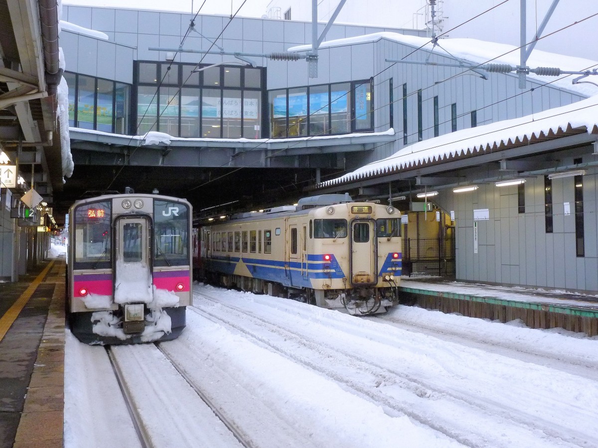 Serie 701 des Bezirks Akita - Begegnungen: Im Hauptbahnhof Akita wartet Zug 701-2 neben dem Dieselzug auf die Oga Halbinsel, geführt von KIHA 40 523. 12.Februar 2013. Peter Ackermann