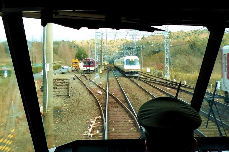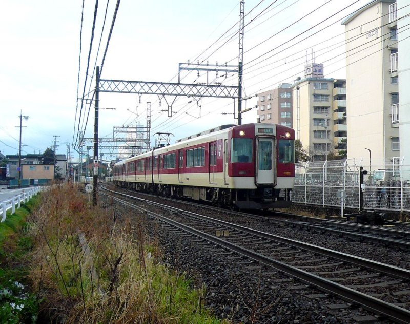 Der Kintetsu-Konzern - der klassische Intercity ( Sonder-Schnellzugs -) Typ, Serie 12000, Gruppe 12200. Diese Züge entstanden 1969-1976 in recht grossen Stückzahlen für 1435mm- (166 Wagen) und (ähnlich) für 1067mm-Spur. Heute sind einige ausgemustert; es gibt 2- und 4-Wageneinheiten. Auch der Kaiser hat solche Züge (nach Anpassung) benützt. Hier durchfährt ein Zug der Gruppe 12200 die Station Tsu-Edobashi, 23.Februar 2009.