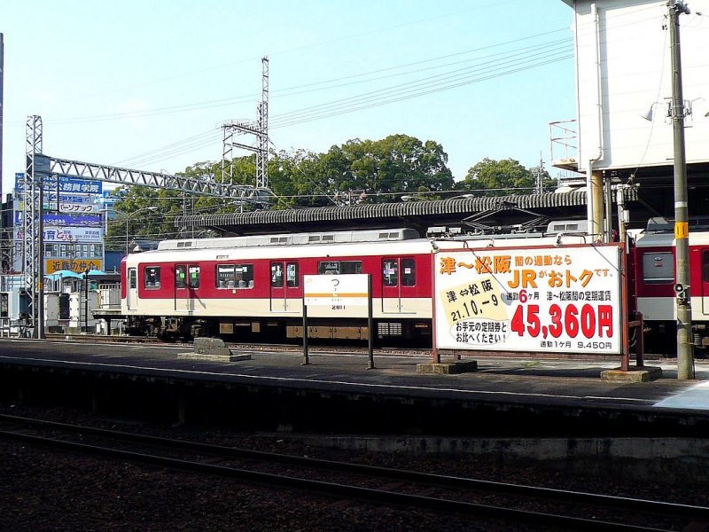 Der Kintetsu-Konzern als Konkurrenz: Mit dem Kintetsu-Zug 2811 (Typ 2800, Baujahr 1972-1979) im Hintergrund sehen wir eine grosse Tafel, auf der die JR kundtut, dass sie für Penlder in die Nachbarstadt Matsusaka billiger ist als die Kintetsu. Da der Kintetsu-Konzern aber beim Grundstückhandel die Nase vorn hat, wohnen viele Leute entlang der Kintetsu-Strecke. Tsu, 26.Februar 2009.