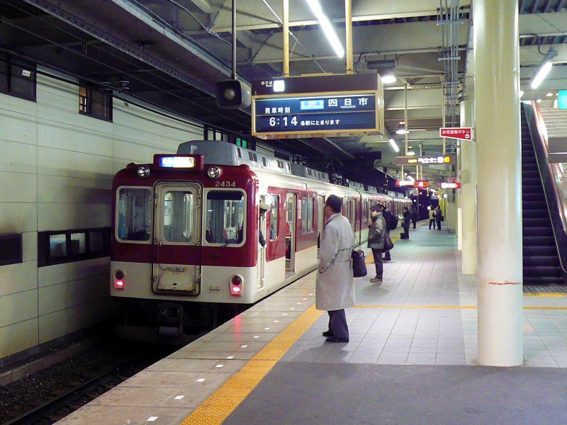 Der Kintetsu-Konzern: Auf diesen Bummelzug so früh am Morgen will keiner; man wartet lieber auf den Express, um schnell in die grossen Städte zu kommen. Ein Zug des Typs 2430, als 3- und 4-Wagenzüge ab 1971 gebaut. Hier steht 2434 am 24.Februar 2009 in Tsu.