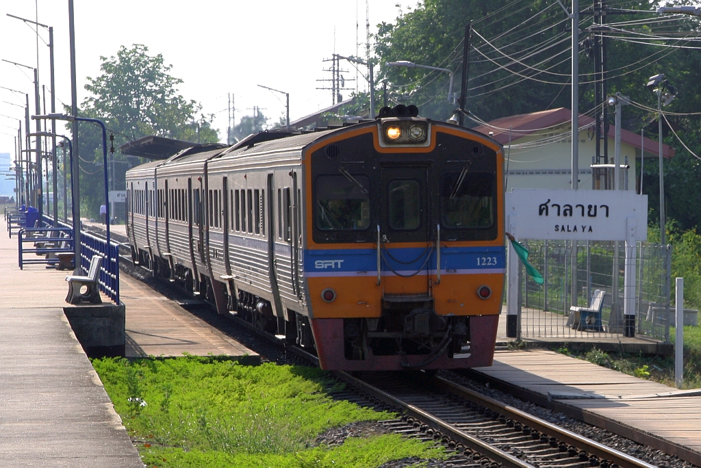 Comuter Special 1129 (Thon Buri - Nakhon Pathom) mit dem NKF 1218 als erstes Fahrzeug fährt am 24.März 2024 in die Sala Ya Station ein. Karl Seltenhammer