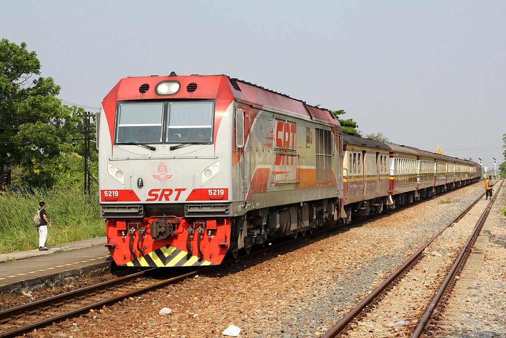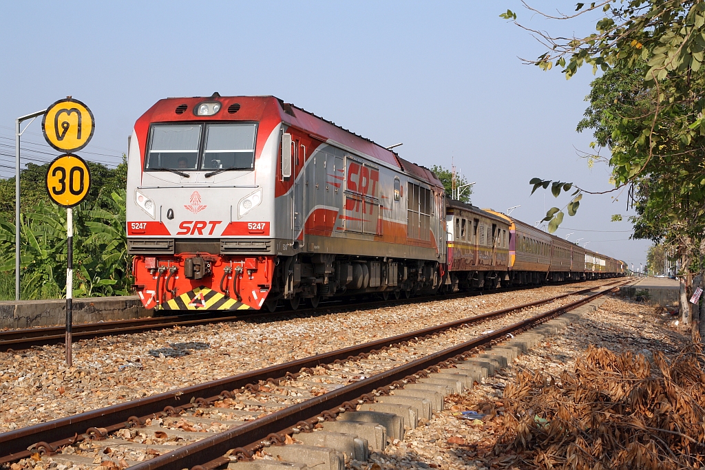 Am 24.März 2024 kreuzt in der Sala Ya Staion die einfahrende ALS 4111 (Co'Co', de, Alsthom, Bj.1974) vor dem ORD 254 (Lang Suan - Thon Buri) die ausfahrende QSY 5247 (Co'Co', de, CRRC Qishuyan, Bj.2022) vor den Sp.EXP 37/45 (Krung Thep Aphiwat - Sungai Kolok (37) / - Padang Besar (45), Zugteilung in der Hat Yai Station). Karl Seltenhammer