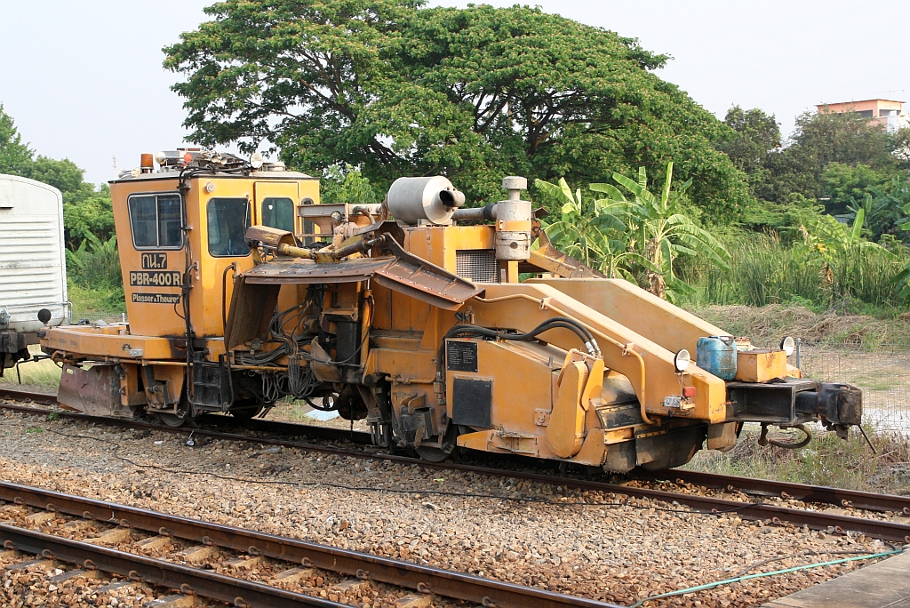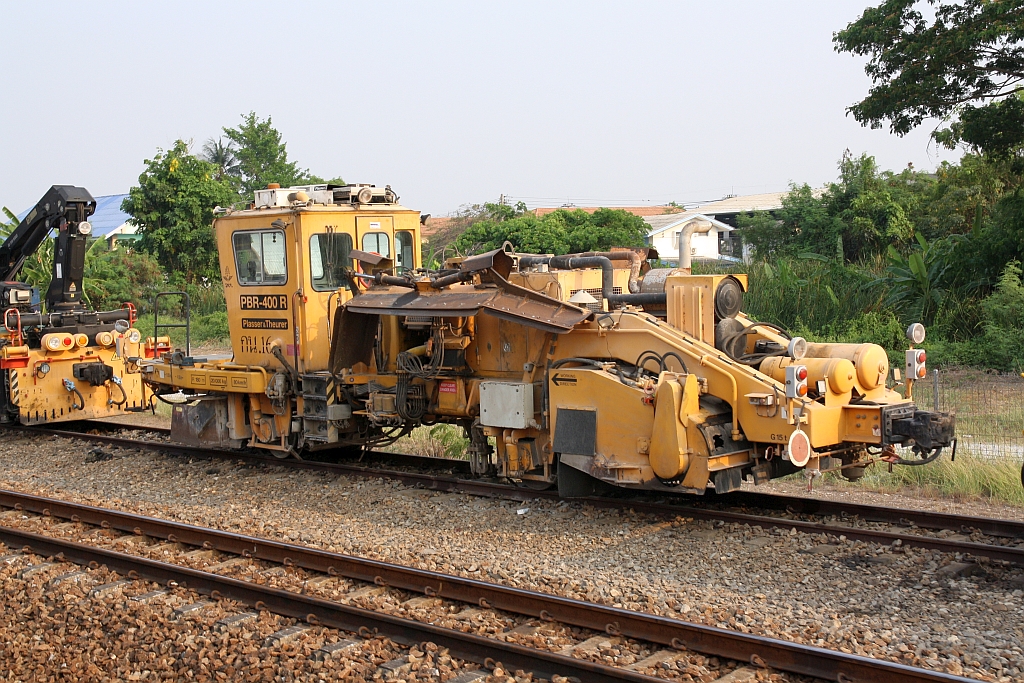 SRT กน.16 (กน.=BR./Ballast Regulator) eine Schotterkehr- und Planiermaschine (Hersteller: Plasser & Theurer, Type PBR-400R, Baujahr: ????, Fab.Nr.: ????) am 24.März 2025 in der Wat Suwan Station. Karl Seltenhammer