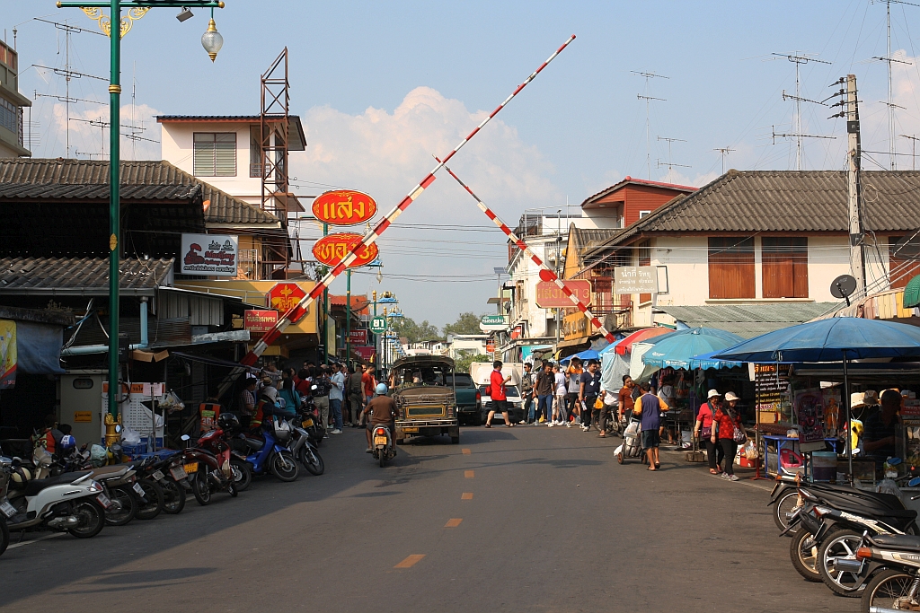Eisenbahnkreuzung in der Mae Klong Station am 20.November 2019. Links der EK befindet sich die Station und rechts der berühmte Markt. Karl Seltenhammer