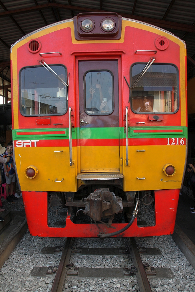 Seit sehr viele Reiseanbieter die Mae Klong Station mit dem gleich anschließenden Markt im Programm haben fahren die Züge dort nur mehr im Schritttempo, dabei sind wegen unachtsamer Fotografen (Idioten darf man ja nicht sagen) 2-4 Notbremsungen nichts außergewöhnliches mehr. - Im Bild vom 01.Mai 2024 hat sich der NKF 1216 als erstes Fahrzeug des ORD 4384 den Weg durch die Menschenmassen erkämpft und kann nun seine Fahrt nach Ban Laem ungehindert fortsetzen.