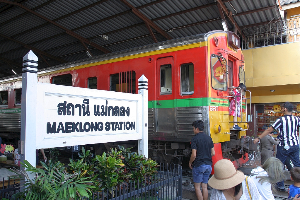 NKF 1216 am 20.November 2019 in der Mae Klong Station. Ohne störende Personen war es unmöglich ein Bild des Stationsschildes mit dem Triebwagen zu machen. Karl Seltenhammer