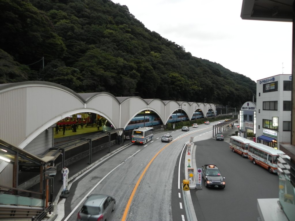 Odakyu Railway Station in Hakone-Yumoto. Auf dem vorderen Gleis steht einer der Limited Express Romancecar vor seiner Abfahrt nach Tokyo (Shinjuku). Jens Hardt