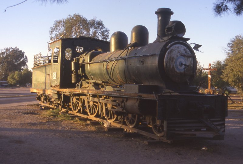 Argentinien 2005-Bahnhof La Rioja: Die Denkmallok am Bahnhof wird an diesem Morgen stimmungsvoll beleuchtet.