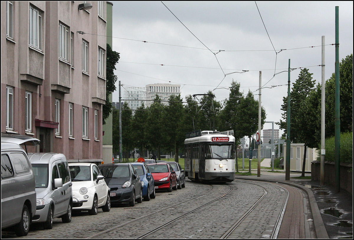 Vier Linien aus dem Nordosten von Antwerpen fahren im Jahre 2007 eröffneten Pre-Metro-Tunnelast ins Zentrum. Die Linie 12 ab fährt etwas weiter nördlich zu diesem Tunnel aber weiterhin oberirdisch durch die Stadt. Hier fährt eine PCC-Tram in der Halenstraat stadtauswärts. Gisela, Matthias und Jonas Frey