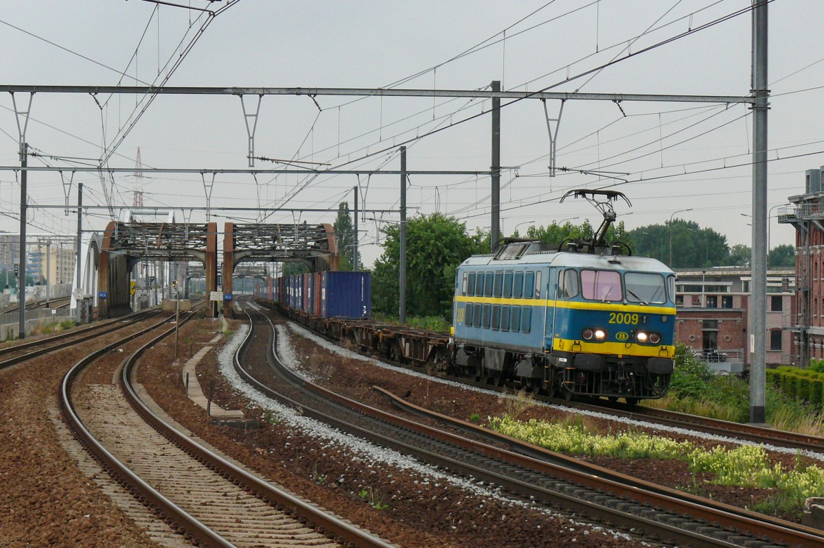 HLE 2009 kommt mit einem Containerzug vom Antwerpener Hafen, und erreicht soeben den Haltepunkt Antwerpon-Dam. Die Aufnahme entstand vom Bahnsteigende am 27/07/2010. Dieter Schumacher