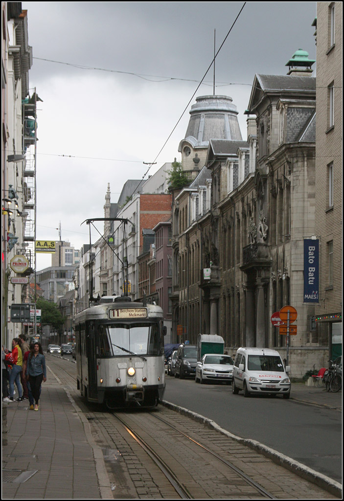Ein PCC-Einzeltriebwagen auf der Linie 11 befährt die langgezogene Schleifenstrecke zum Melkmarkt durch die Antwerpener Altstadt. Diese wird im Uhrzeigersinn befahren. Hier der südliche nach Westen führende Abschnitt in der Lange Nieuwstraat.