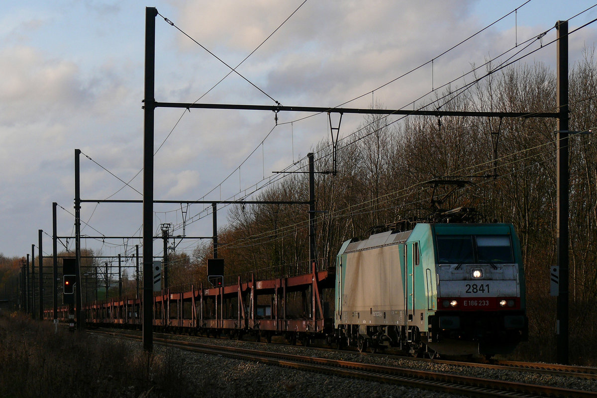 Im Spätnachmittaglicht des 22/11/2009 zog Cobra-Lok 2841 (186 233) einen leeren Autozug über die Montzenroute Richtung Aachen-West, hier aufgenommen kurz vor dem Remersdaeler Viadukt. Dieter Schumacher