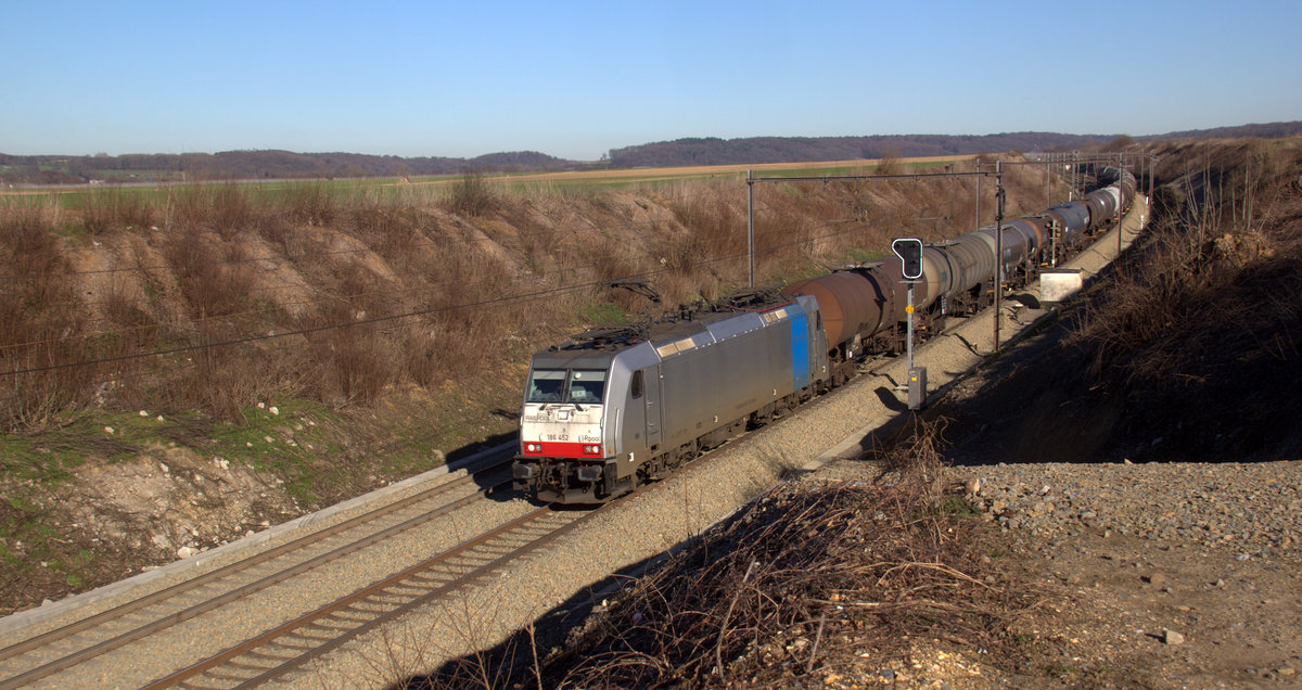 186 452-9 von Lineas/Railpool kommt mit einem Kesselzug aus Ludwigshafen-BASF(D) nach Antwerpen-BSAF(B) und kommt aus Richtung Aachen-West(D),Montzen(B) und fährt durch Berneau(B) in Richtung Vise(B).