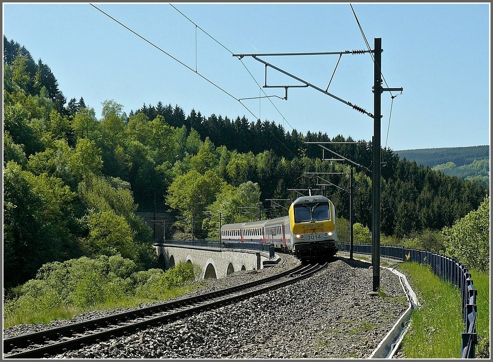 Die 3014 mit dem IR 119 am Haken hat soeben den Tunnel in der Nähe von Coo (B) verlassen und befährt nun die Brücke über die Amblève. 23.05.10 (Hans) De Rond Hans und Jeanny
