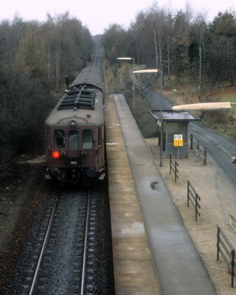 DSB "Lille Nord" (: "kleine Nordbahn", d.h. die Bahnstrecke Hillerød - Fredensborg - Snekkersten - Helsingør): Mo + Cl Haltepunkt Langerød am 27. Dezember 1983. - Heute fahren hier moderne Triebzüge des Typs LINT 41 des Bahnunternehmens Lokalbanen. Kurt Rasmussen