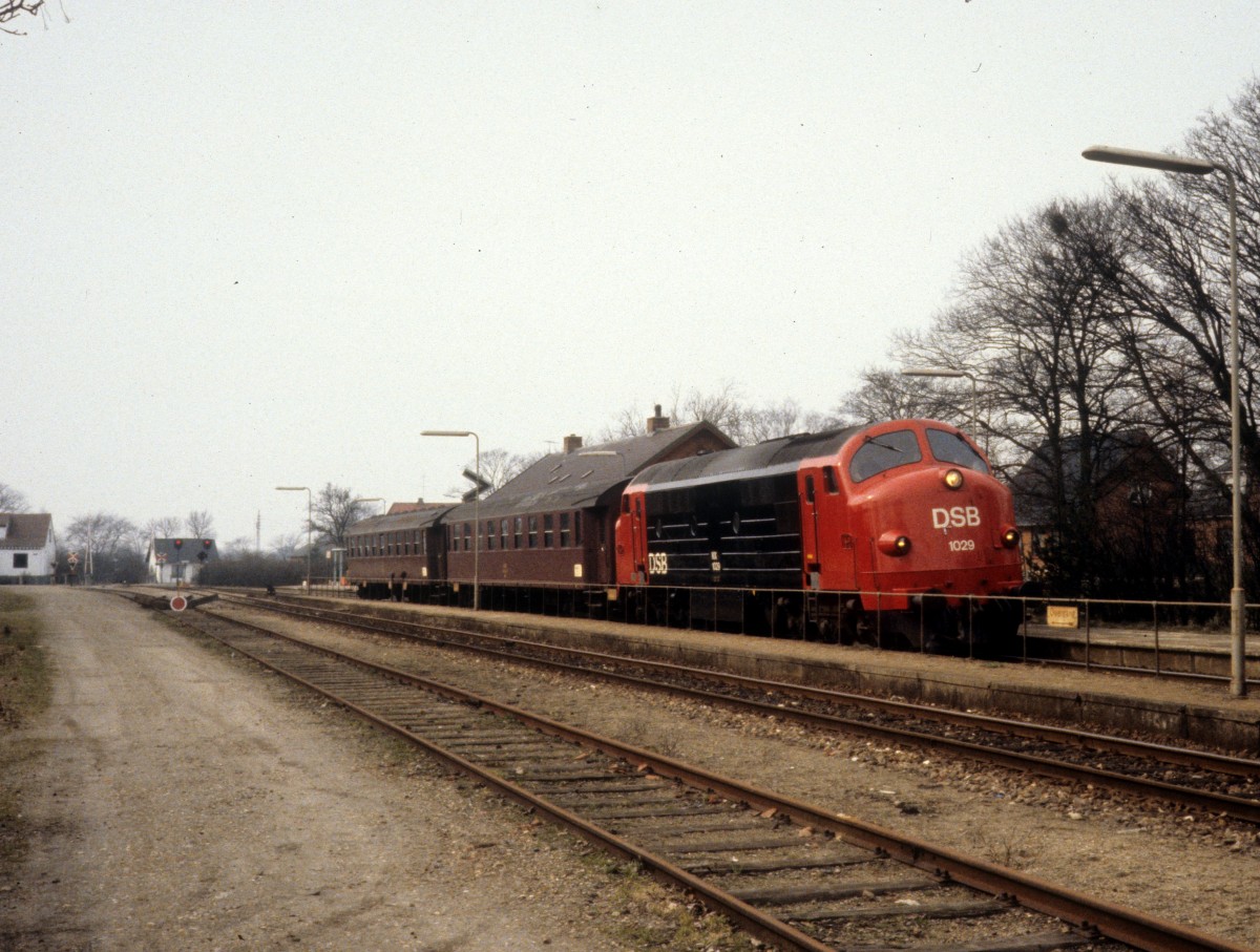DSB-Kleinstadtbahnhöfe: Bahnhof Bording am 9. April 1979. - Am Bahnsteig sieht man einen Personenzug (Mx 1029 + zwei Personenwagen).