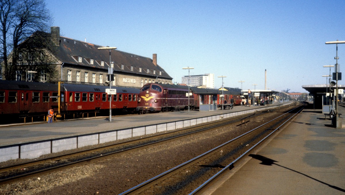 DSB-Bahnhof Næstved am 14. April 1981: Ein Regionalzug bestehend aus der Diesellok My 1119 und Personenwagen hält am Gleis 2. - Der Zug fährt in Richtung Vordingborg.