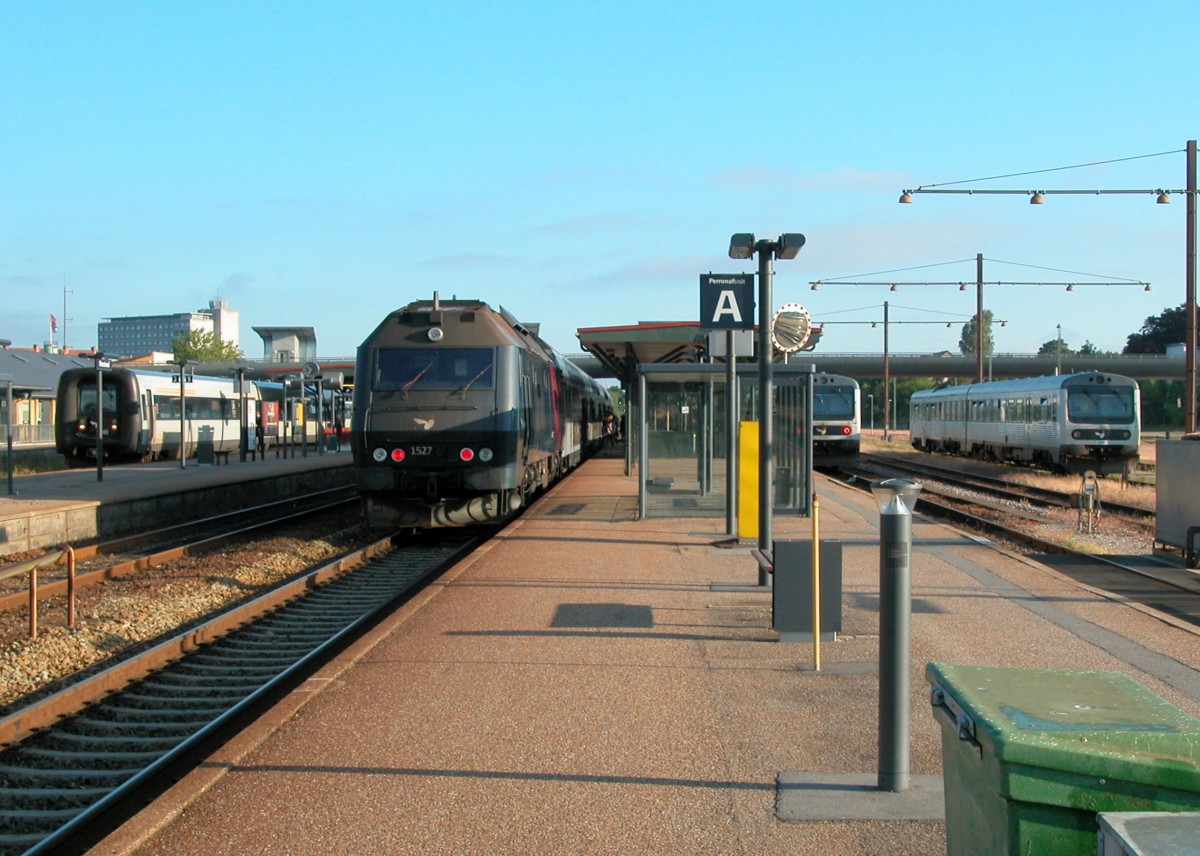 DSB ME 1520 (mit einem Regionalzug) Bahnhof Næstved am 10. Februar 2007. - Die dieselelektrische ME 1520 wurde 1983 von Henschel und Sohn gebaut. - Scan eines Farbnegativs. Film: Kodak Gold 200-6. Kamera: Leica C2.