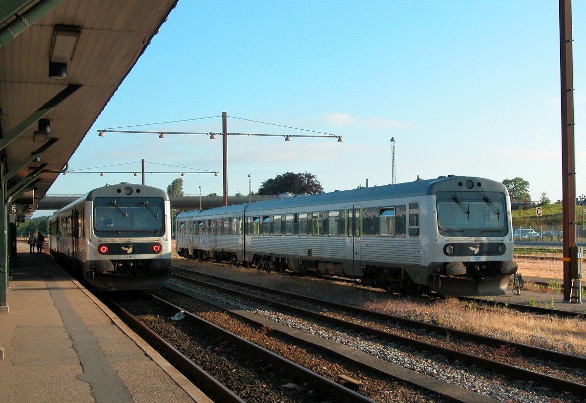 DSB MRD 4261 (Regionalzug nach Roskilde über Køge,  Lille Syd  (=  Kleine Südbahn ) / MRD 4247 (abgestellter Zug) Bahnhof Næstved am 19. Juni 2012. - Die beiden dieselhydraulischen Triebwagen wurden 1983 von der Fa Scandia in Randers gebaut. Sie haben einen Deutz F12L 41 3F-Dieselmotor und können 130 km/h fahren.