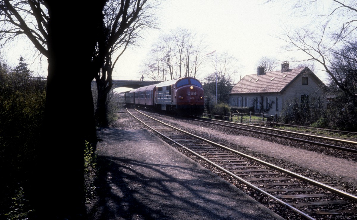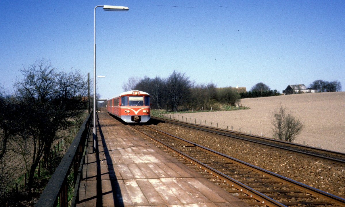 DSB Mx 1008 (mit einem Personenzug) hält am 14. April 1981 am Haltepunkt Ring. - Der Haltepunkt wurde 1982 geschlossen.
