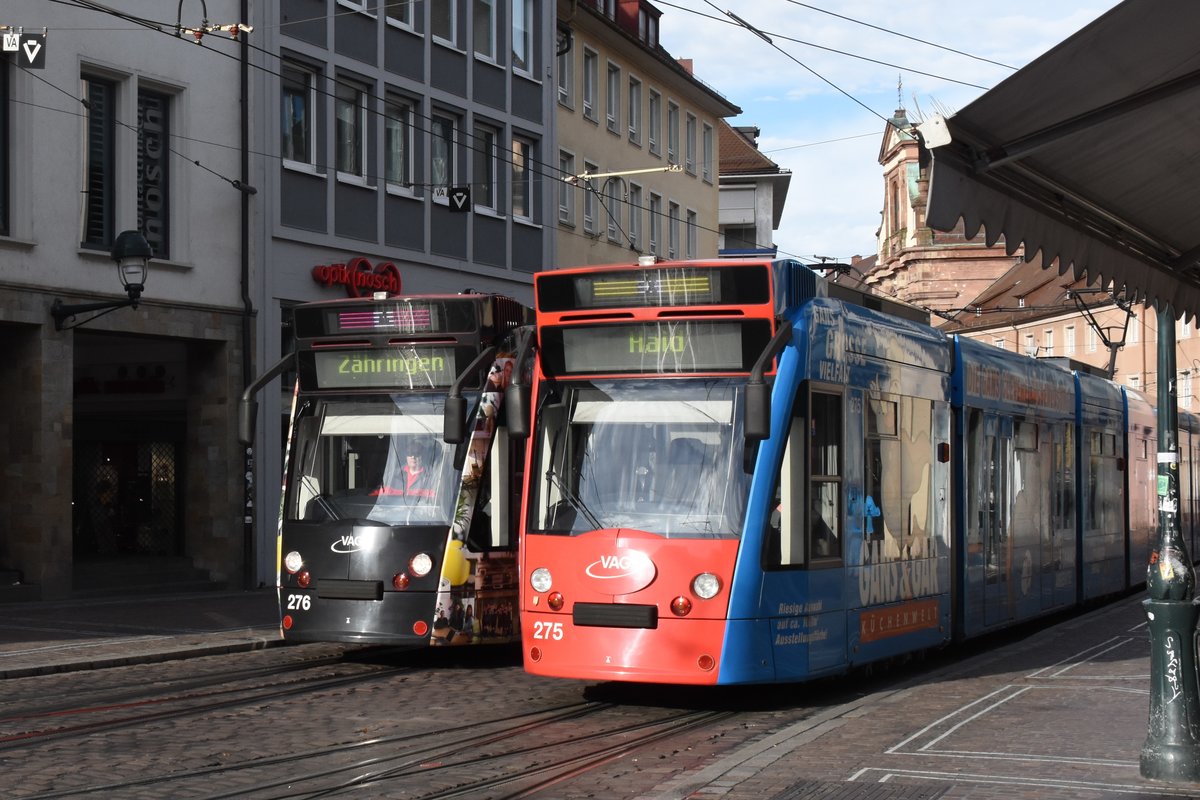 FREIBURG im Breisgau, 20.10.2019, links Zug Nr. 276 als Tram4 nach Zähringen, rechts Zug Nr. 275 als Tram3 nach Haid, beide in der Bertoldstraße Reinhard Zabel