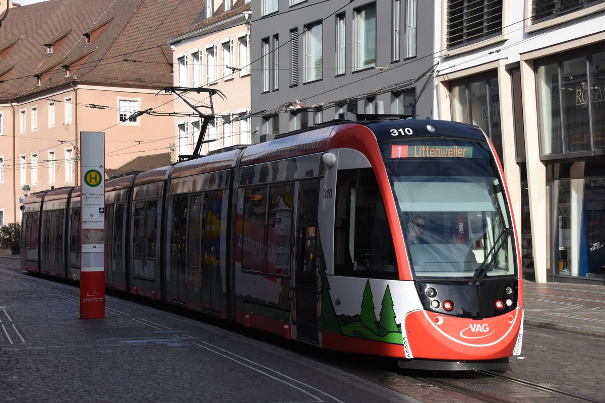 FREIBURG im Breisgau, 20.10.2019, Zug Nr. 310 als Tram1 nach Littenweiler in der Salzstraße zwischen den Haltestellen Bertoldsbrunnen und Oberlinden Reinhard Zabel
