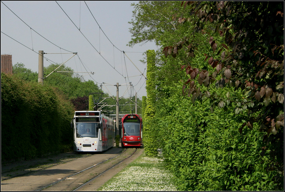 Zwischen grünen Wänden: Blick von der Haltestelle Paduaallee in die 1995 eröffnete Verlängerung der ersten Strecke nach Landwasser.