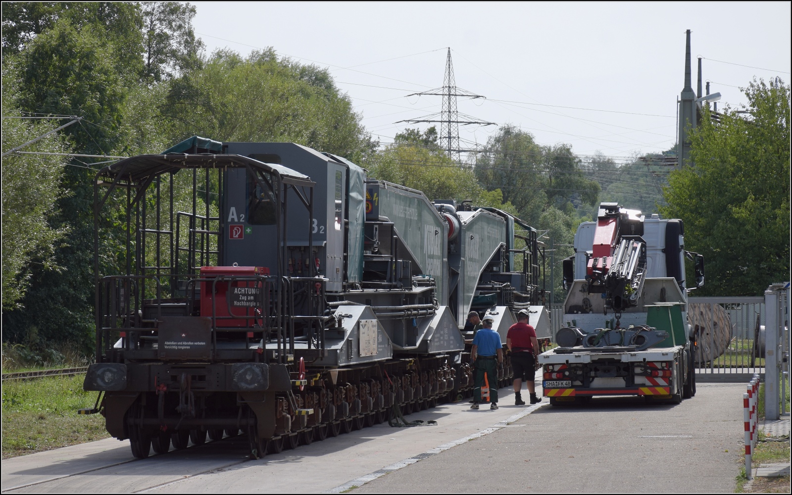 Weiter wurde das Trafo-Monster ganz schnell vom Bahnanschlussgleis mit dem Tieflader über die Gemeindestraße ins neue Umspannwerk befördert. September 2022. Olli