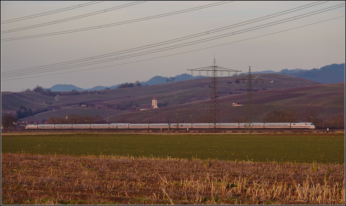 Neue Einsichten im Markgräflerland. Der Vertrag von Lugano soll 2 Jahre nach Fertigstellung des Gotthardbasistunnels doch noch in Angriff genommen werden. Ein ICE 1 in voller Länge vor den Auggener Weinbergen. Das geht hier neuerdings, weil die Strecke in einigen Bereichen zur Einrichtung der Baustellen freigeschnitten wurde. Von Schliengen nach Auggen betrachtet, Februar 2019. Olli