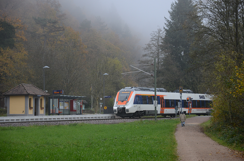 Das Wartehäuschen des Haltepunktes Etzenbach hat was. ET 151 kommt am 24. November 2014 als SWE 72518 nach Bad Krozingen aus Münstertal an. Friederich Rieber