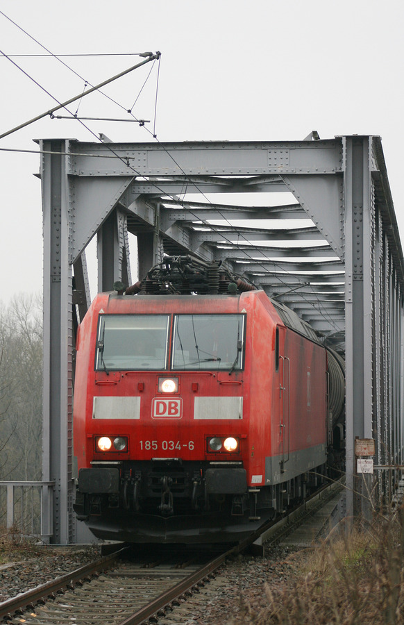 185 034 hat mit einem Güterzug nicht nur den Rhein überquert sondern auch gleichzeitig die Staatsgrenze Frankreich / Deutschland.