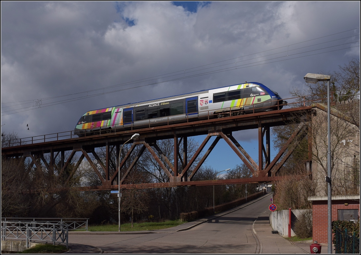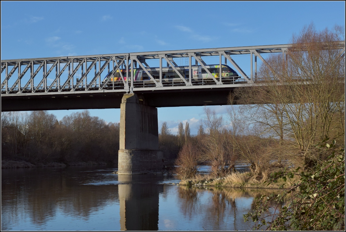 Bahn im Markgräfler Land. Die Rheinbrücke von Neuenburg mit Triebwagen beim Grenzübertritt. Zwar kaum sichtbar aber für das Protokoll, es ist X 72901. Olli