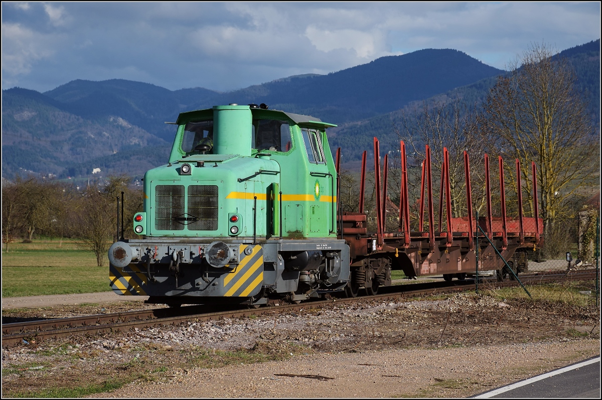 Bahn im Markgräfler Land. Unverkennbar ist der vorherige Besitzer der Deutz KG 230 B. Bevor sie zum Schwellenhersteller Richtberg kam, war sie bei Britisch Petroleum in Betrieb. Neuenburg, März 2019. Olli