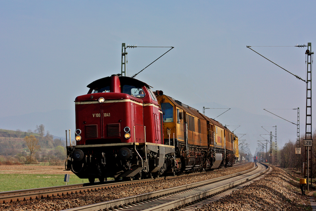 Bis auf weiteres verkehren sämtliche Züge mit Dieselloks, so wie hier die V100 1041 kurz vor Riegel (Foto: 31.3.11) Mathias D.