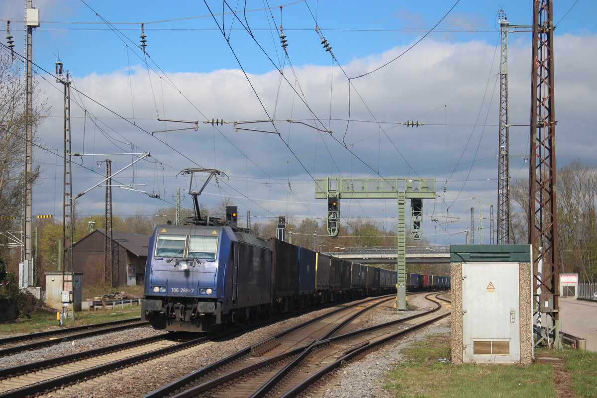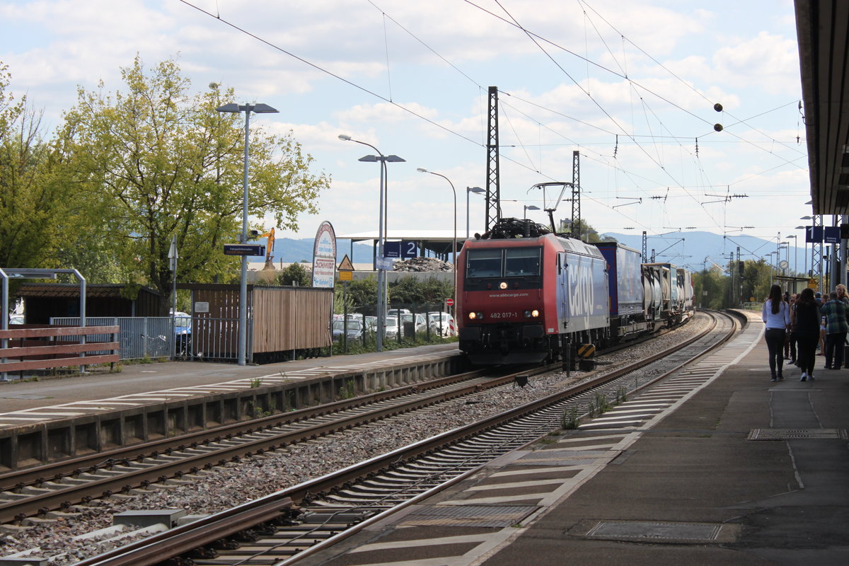 Am 09.09.2015 durchfährt 482 017 von SBB Cargo mit einem KV-Zug den Bahnhof Riegel-Malterdingen in Richtung Norden, währenddessen am Nachbargleis ein RE nach Basel mit BR 146 einfährt. David Endlich