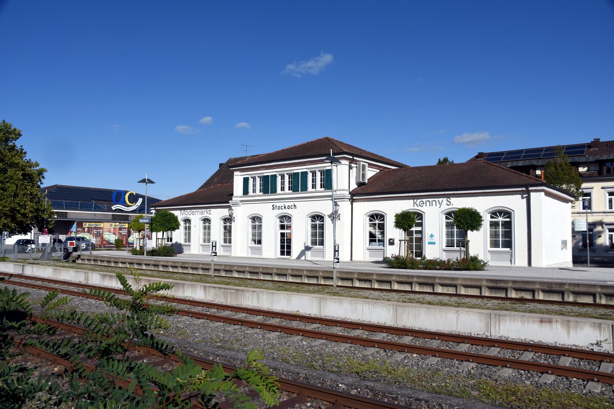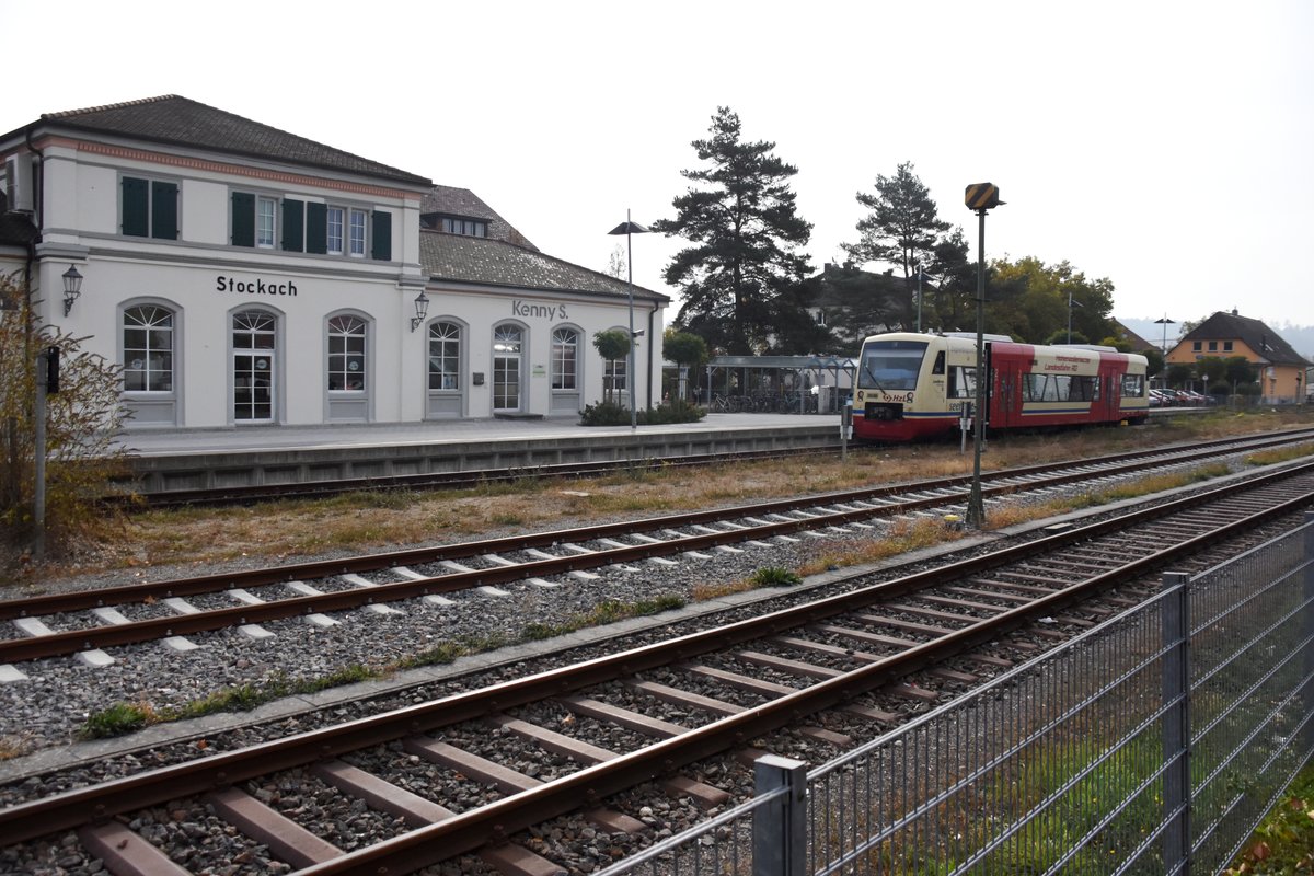 STOCKACH (Landkreis Konstanz), 23.10.2018, Blick auf das Bahnhofsgebäude, das nicht mehr als solches genutzt wird, rechts ein ausfahrender Zug der Hohenzollerischen Landesbahn nach Radolfzell am Bodensee Reinhard Zabel