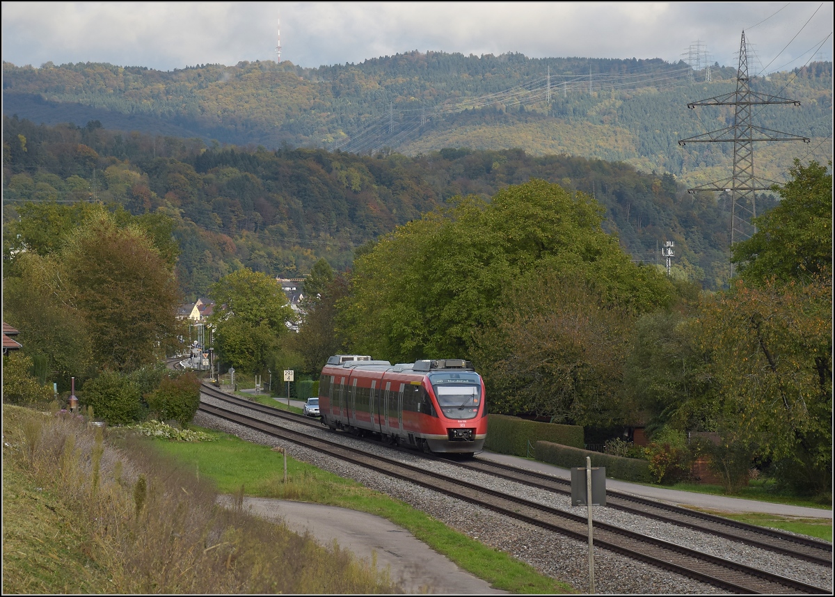 Bahn am Hochrhein. Für den Nahverkehr werden mittlerweile vorwiegend die Problembären 644 eingesetzt, deren Hitzeverträglichkeit wird im Sommer immer auf eine härteste Probe gestellt, häufig mit ungünstigem Ausgang. Auch von der Beschleunigung können sie mit ihren weiter eingesetzten Vorgängern 641 nicht mithalten. Hier 644 036 in Schwörstadt mit dem Hotzenwald im Hintergrund. Oktober 2017. Olli