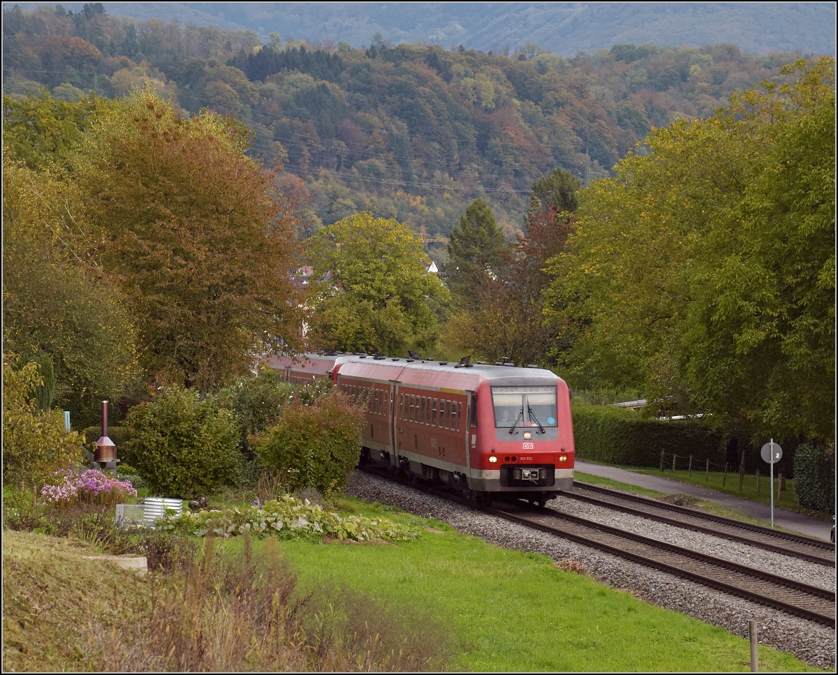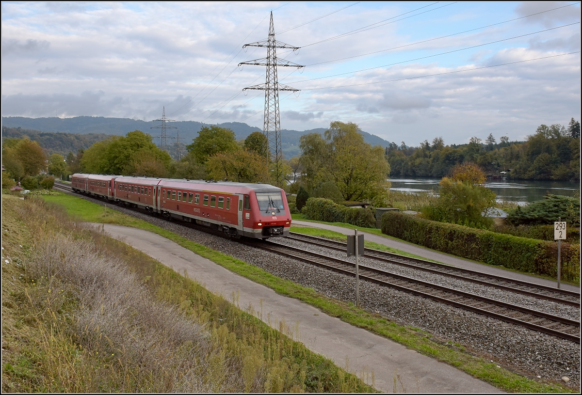Bahn am Hochrhein. In Schwörstadt geht es für 611 012 und 014 mit 160 Sachen den Rhein entlang. Leider sind die Tage dieser Baureihe bereits gezählt, auch wenn sie vorerst unverzichtbar scheint. Oktober 2017. Olli
