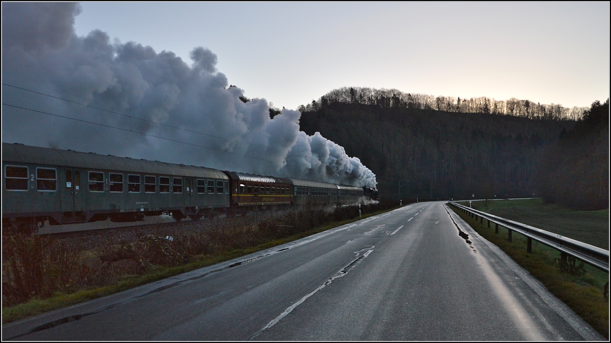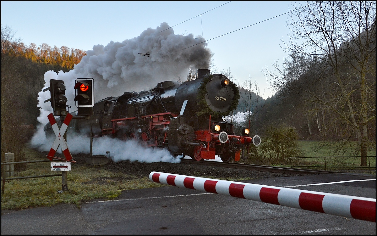 Schuss und... daneben. Der Zug war schneller, so dass ein Teil der Lok noch verdeckt ist, weil man den besten Platz noch nicht erreicht hat... Dieser Bahnübergang in Talhausen ist übrigens der unseelige Ort, an dem vor nicht allzulanger Zeit ein Tieflader hängenblieb und von einer Regionalbahn gerammt wurde. Dezember 2014. Olli