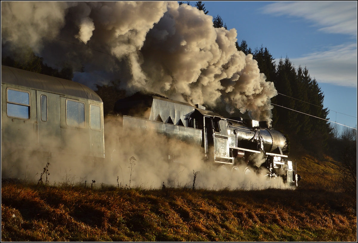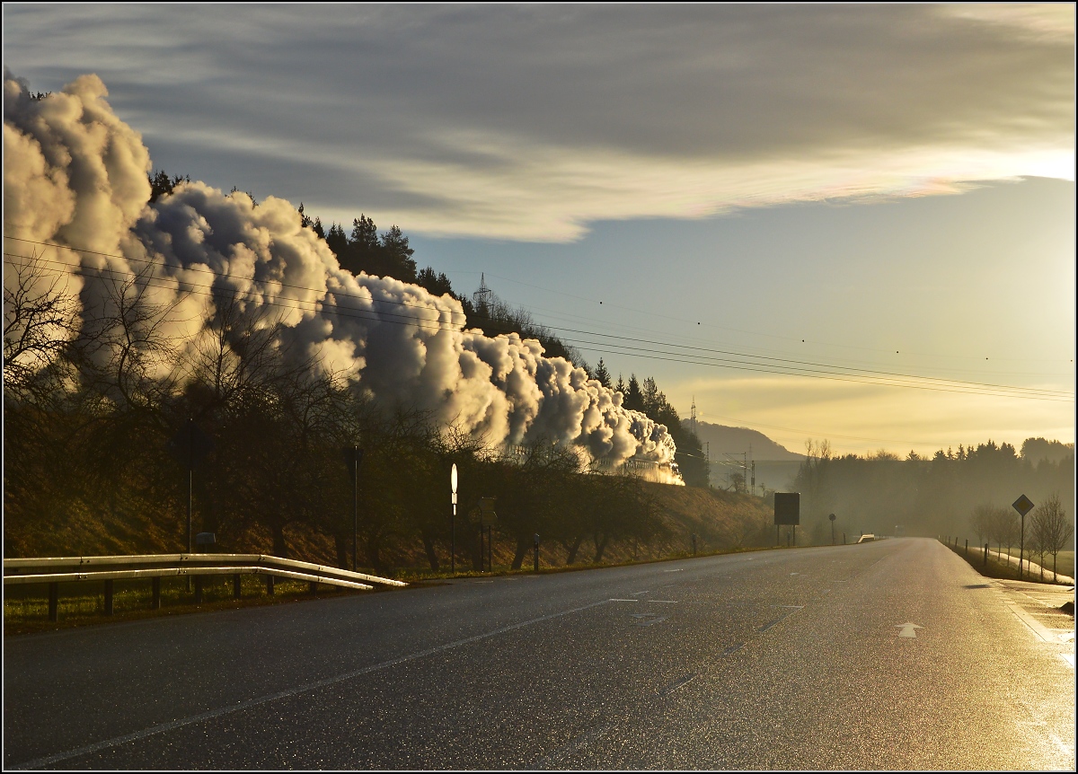 Mit Volldampf das Primtal hinauf. Bei Aldingen lässt es die 01 519 krachen. Der Zug muss schließlich noch zum Weihnachtsmarkt nach Konstanz. Dezember 2015. Olli