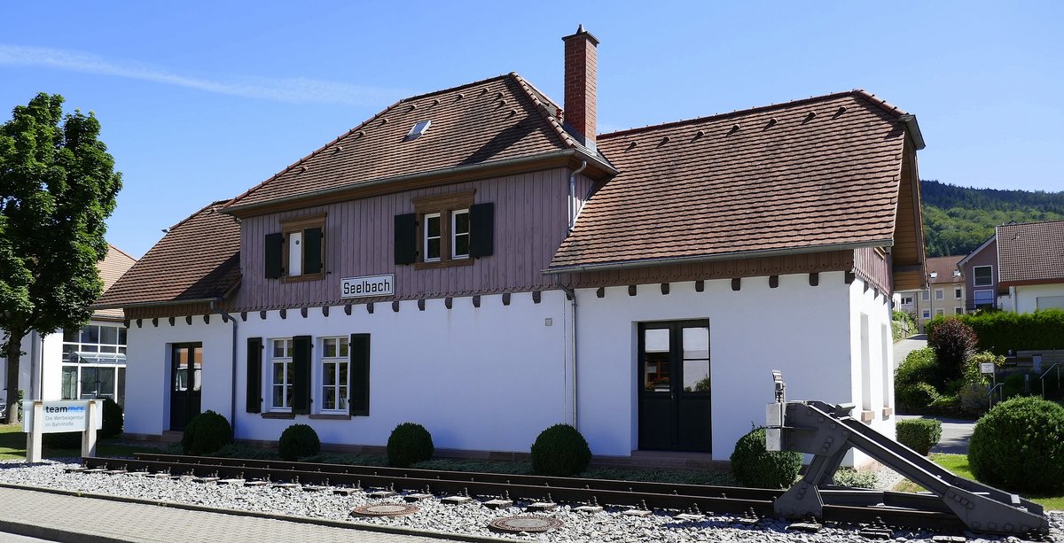 Seelbach im Schuttertal/mittlerer Schwarzwald, ein Stück Gleis und ein Prellbock vor dem ehemaligen Bahnhofsgebäude erinnern an die 1894 eröffnete, 20Km lange, Bahnlinie Ottenheim-Lahr-Seelbach, die bis 1952 in Betrieb war, Juli 2020