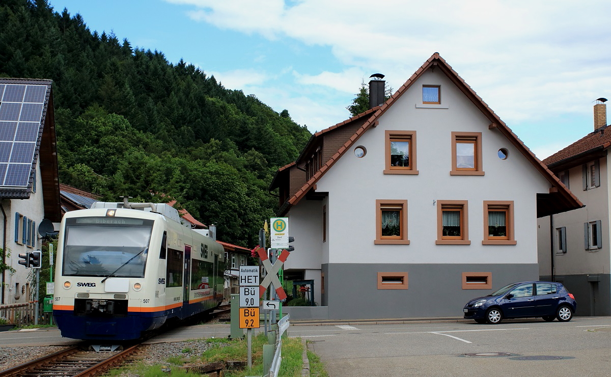 Gleich am Ortseingang von Oberharmersbach (Kbs 722) findet sich – wie ich meine – das schönste Motiv im Tal der ganzen Strecke. „Willkommen in Oberharmersbach“. Damit sind sicher die beiden OSB-Triebwagen im Hintergrund gemeint. Datum: 6. Juni 2010. Friederich Rieber