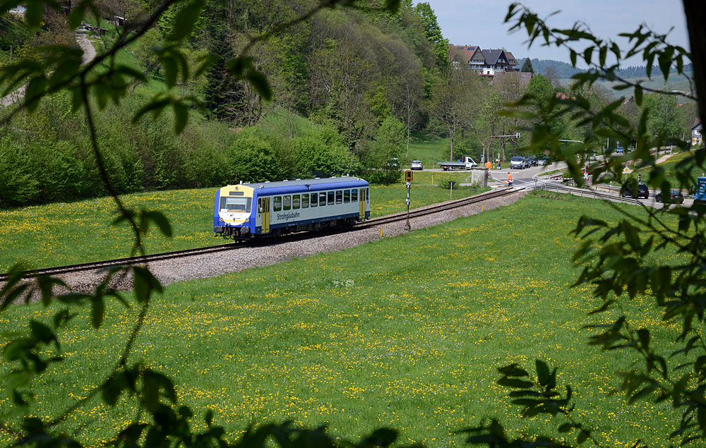 Am 29. April 2015 war der von der Strohgäubahn (WEG) ausgeliehene(?) VT 413 bei der SWEG im Achertal (KBS 717) unterwegs. Zwischen Furschenbach und Ottenhöfen ist dieses Bild als SWE 87714 nach Ottenhöfen entstanden. Friederich Rieber