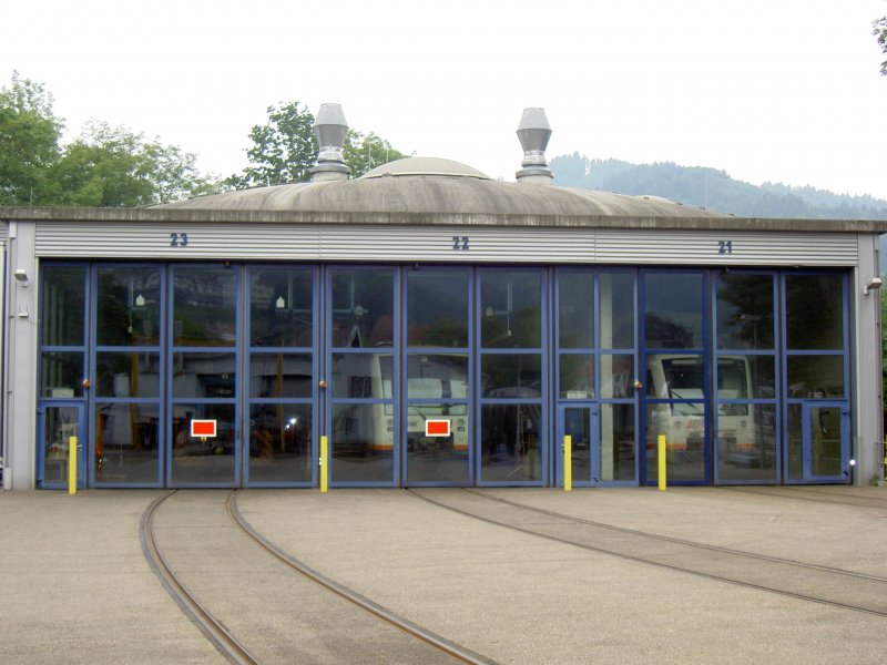 Der Lokschuppen der SWEG in Ottenhöfen am 27. Juli 2008. Heute sind fünf OSB-Triebwagen und die V70 im Schuppen. Parallel fährt ein weiterer OSB-Triebwagen auf der Strecke. Stefan B.