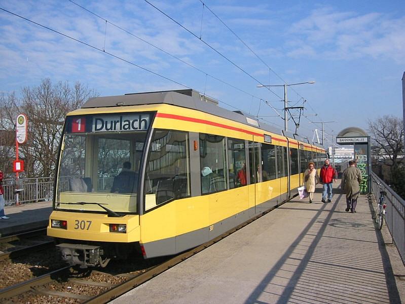 Eine Niederflurstraßenbahn, eingesetzt auf der Linie 1 zwischen den Karlsruher Stadtteilen Durlach und Oberreut, hält am 09.02.2005 an der Haltestelle Bannwaldallee, die sich auf der Straßenbahn- und Fußgängerbrücke zwischen der Hardecksiedlung und der Europahalle befindet. Thomas Schmidt