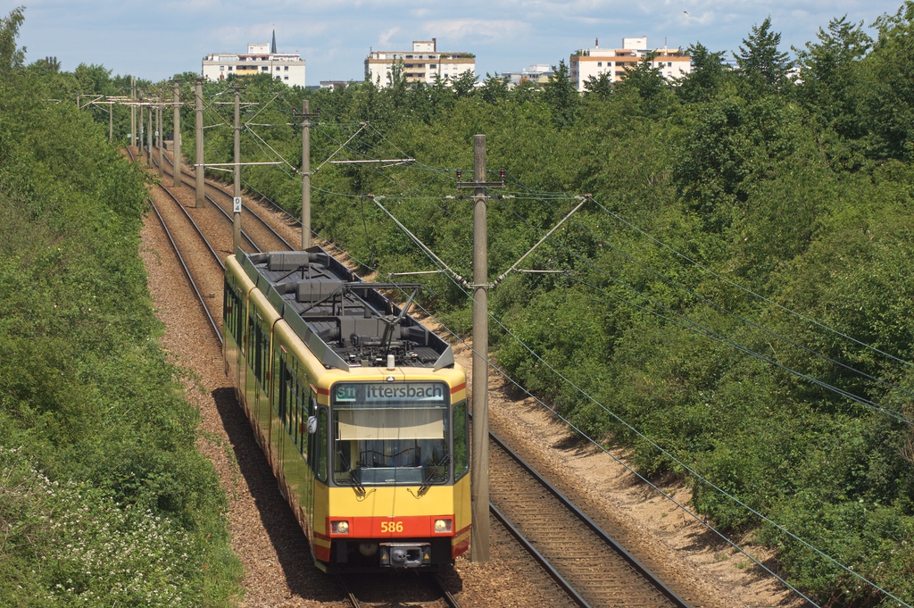 Die S11 unterwegs nach Ittersbach. Im Hintergrund Karlsruhe/Neureut (10.6.2012)