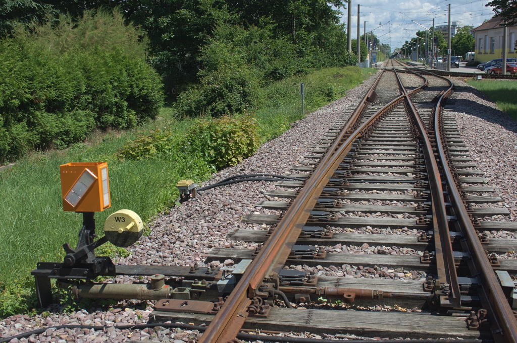 Weiche mit Stellhebel bei Karlsruhe/Neureut. Im Hintergrund die dann zweigleisige Hardtbahn der AVG nach Linkenheim/Hochstetten (S1/S11)