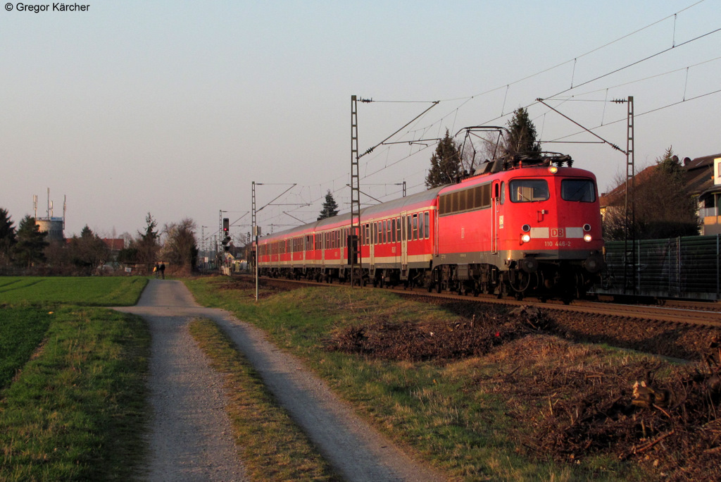 Aufgrund dezimierter 425-Bestände im Bh Ludwigshafen gibt es auf der KBS 700 wieder einen ganztägigen Umlauf für die Bügelfalte als 425-Ersatz. Am 21.03.2012 nimmt die 110 446-2 mit der RB 38863 (Biblis-Karlsruhe) nach planmäßiger Überholung in Blankenloch durch ICE 279 im letzten Abendlicht das letzte Teilstück nach Karlsruhe in Angriff. Gregor Kaercher